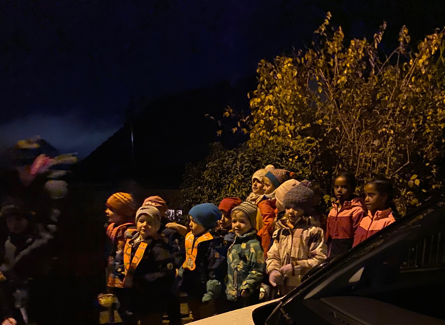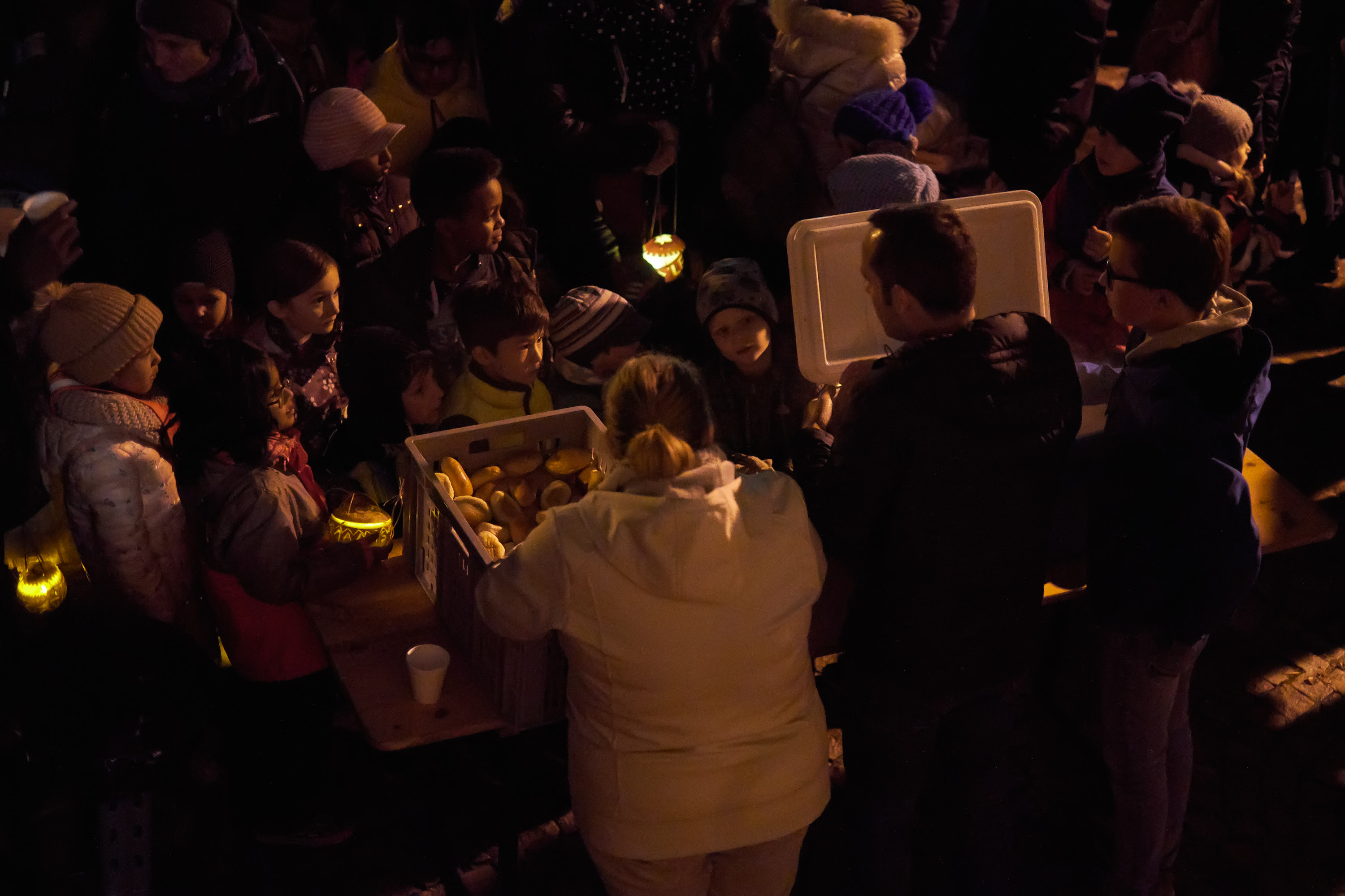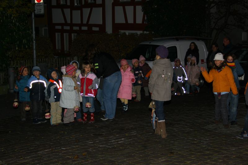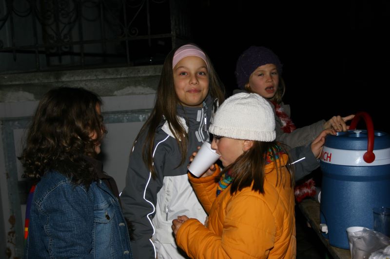 Im grossen Singkreis wurden einige traditionelle Räbeliechtli-Lieder gesungen, begleitet von den Kindergärtnerinnen und einer Gitarre. Danach verköstigte der Quartierverein die Kinder mit Würstchen und Orangenpunsch.