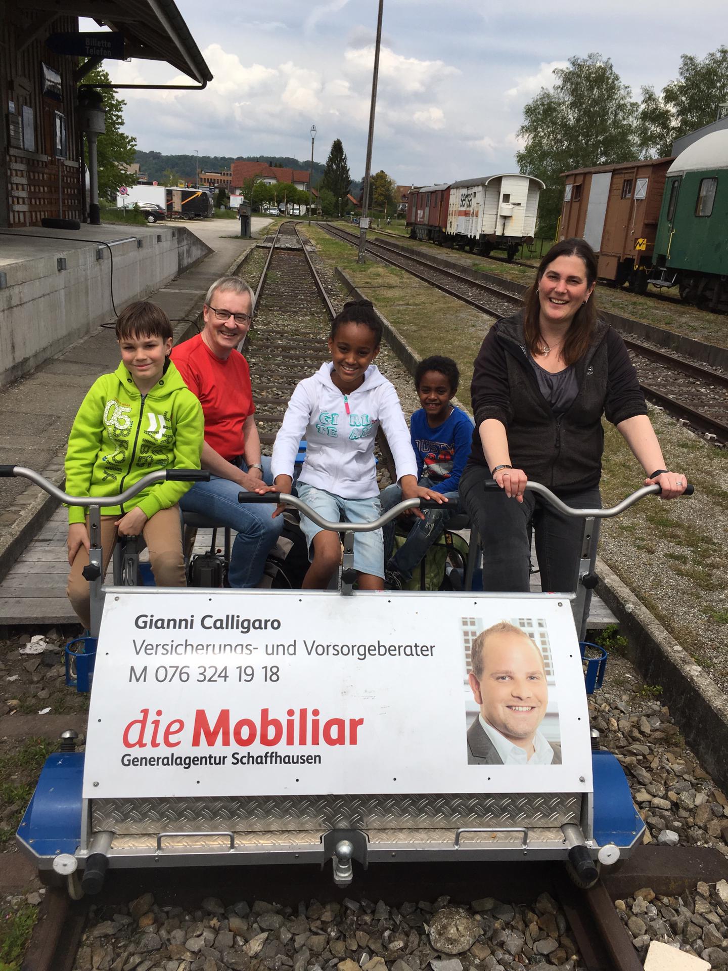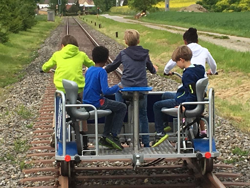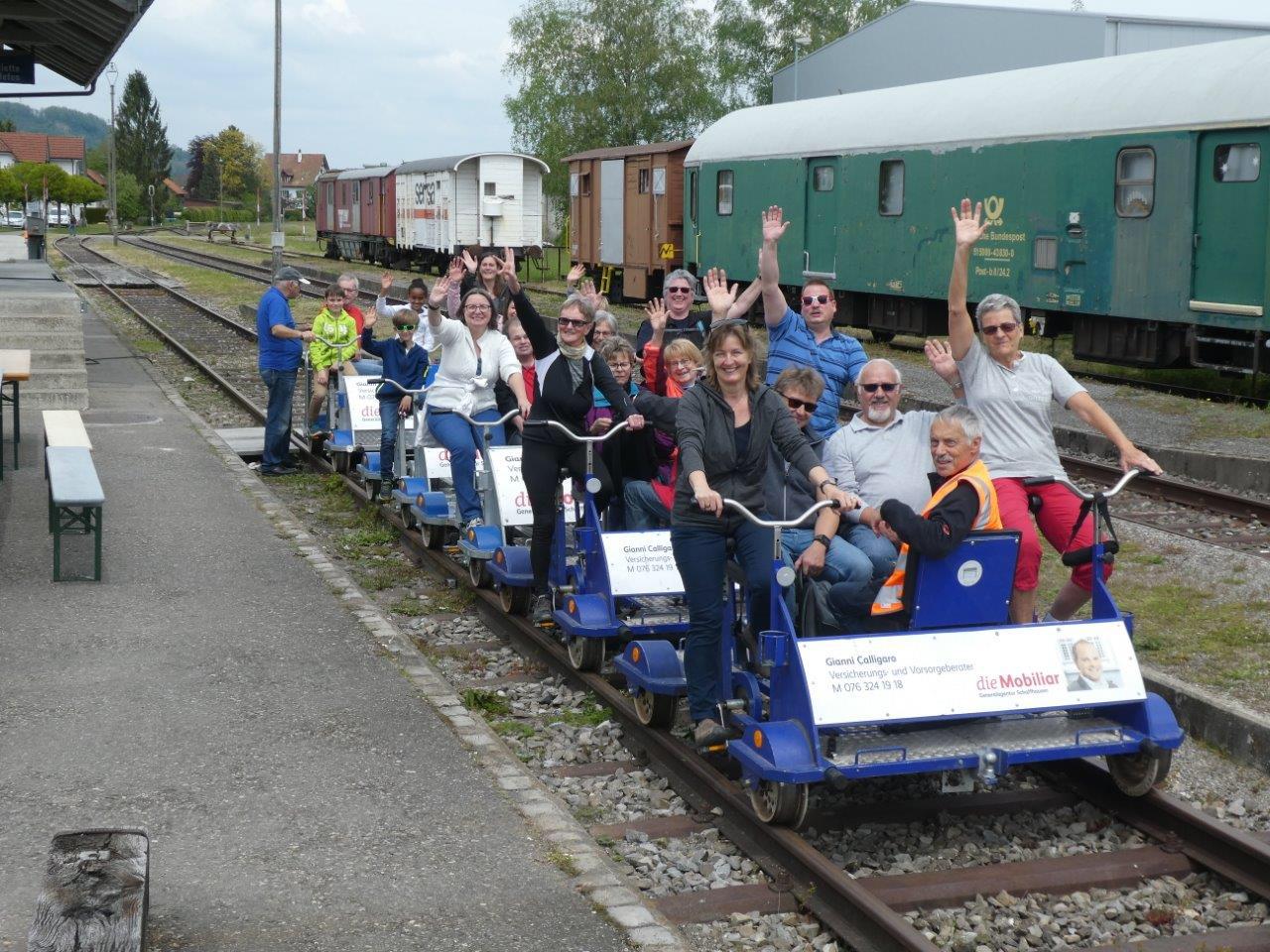 23 Personen nahmen am 18. Mai 2019 am Frühlings-Ausflug vom Quartierverein Buchthalen teil: Mit Schienenvelos fuhren sie von Ramsen über die Rheinbrücke in Hemishofen und zurück. Jeweils fünf Personen auf einem Velo. Die Fahrt hat allen Teilnehmenden grossen Spass gemacht: Jung und Alt haben den Ausflug mit anschliessendem Apéro genossen.