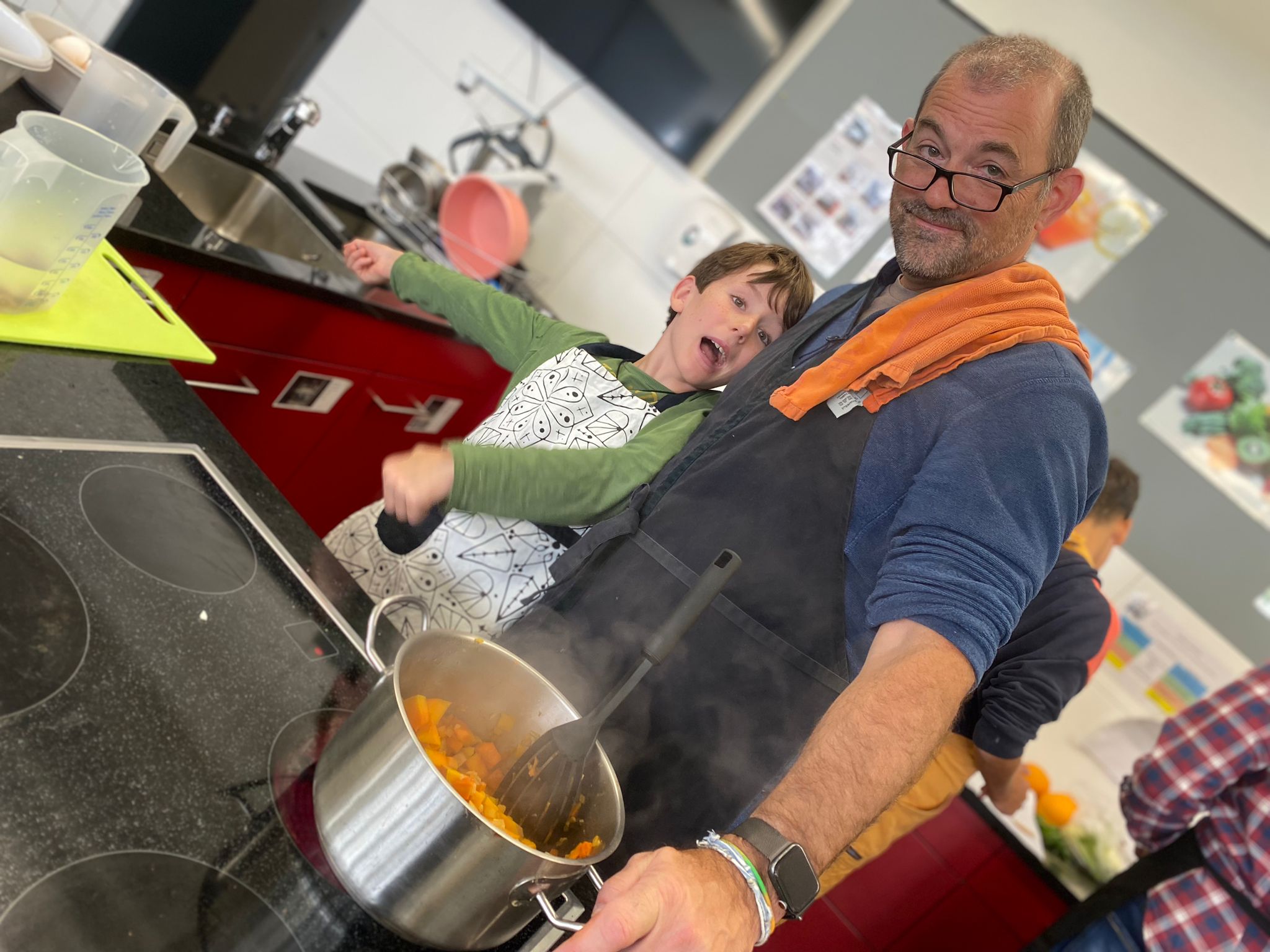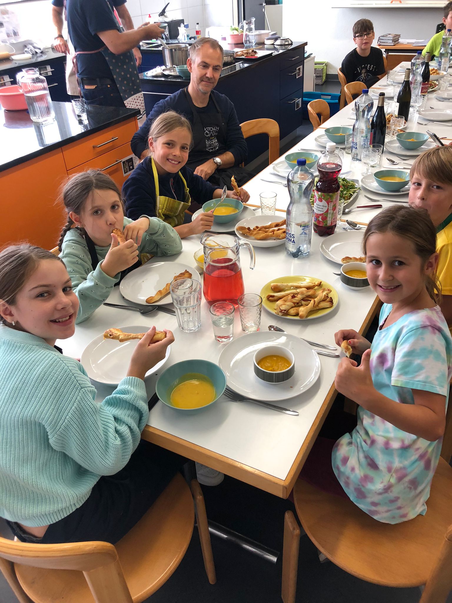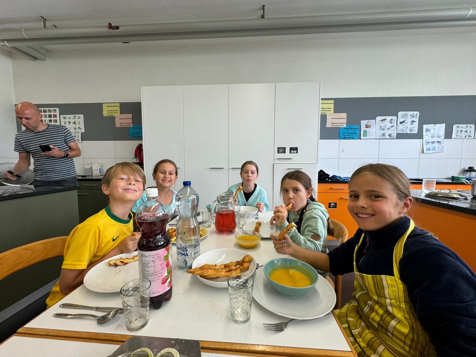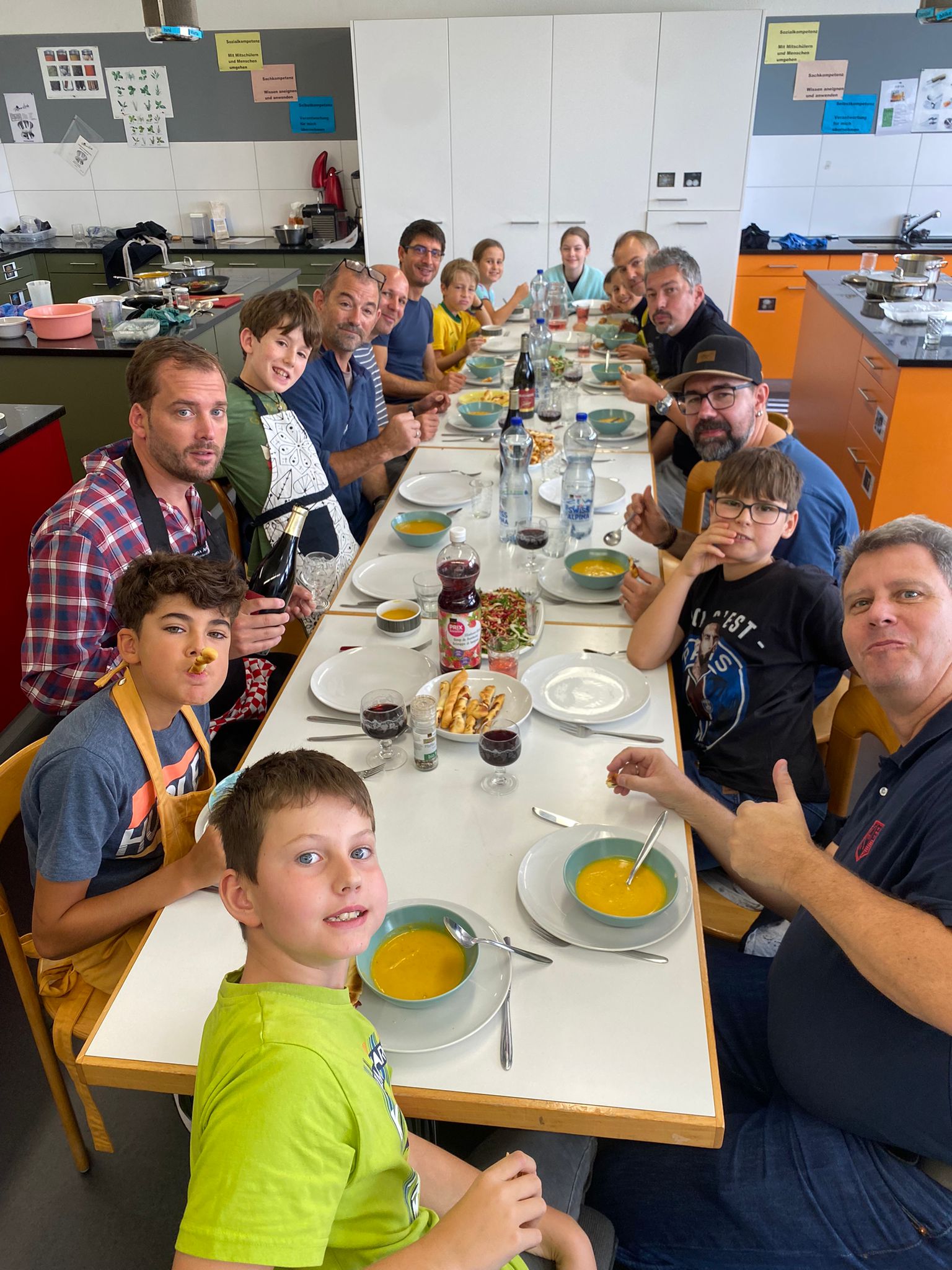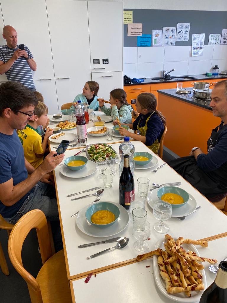 Die Hoffnungen vieler der acht teilnehmenden Väter lagen wohl nach Bekanntgabe des Menus in ihren Kindern oder Lisa, unserer Kochlehrerin… Am Samstag des Kochkurses machten sich die Kinder und Väter voller Elan daran, das 4-Gänge-Menu mit Zusatzdessert zum Mitnehmen zu kochen. Der Wille war bei allen spürbar, das eine oder andere Malheur konnte aber nicht vermieden werden. Zum Glück wurden einige Eier zu viel mitgebracht… Trotz gleichem Menubeschrieb konnte man bei einigen Gerichten geschmackliche sowie auch optische Unterschiede ausmachen. Der Freude ab der gelungenen Kürbissuppe oder dem geschmackvollen Schweinsfilet mit Bohnen im Speckmantel konnte dies aber keinen Abbruch tun. Zufrieden wurde das Erbrachte anschliessend bei einem feinen Glas Wein oder Sirup gegessen. Besten Dank an Lisa für die Geduld und fachkundige Unterstützung.