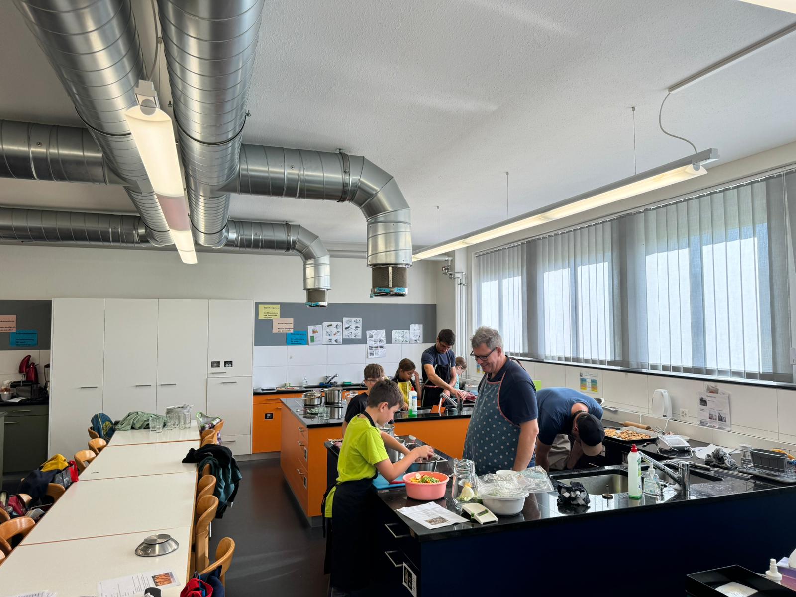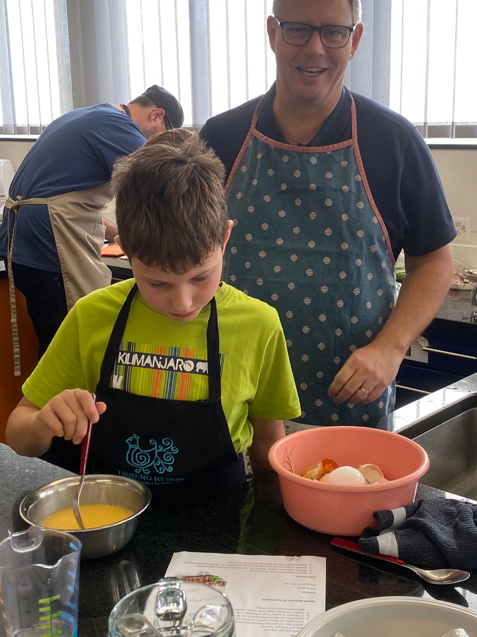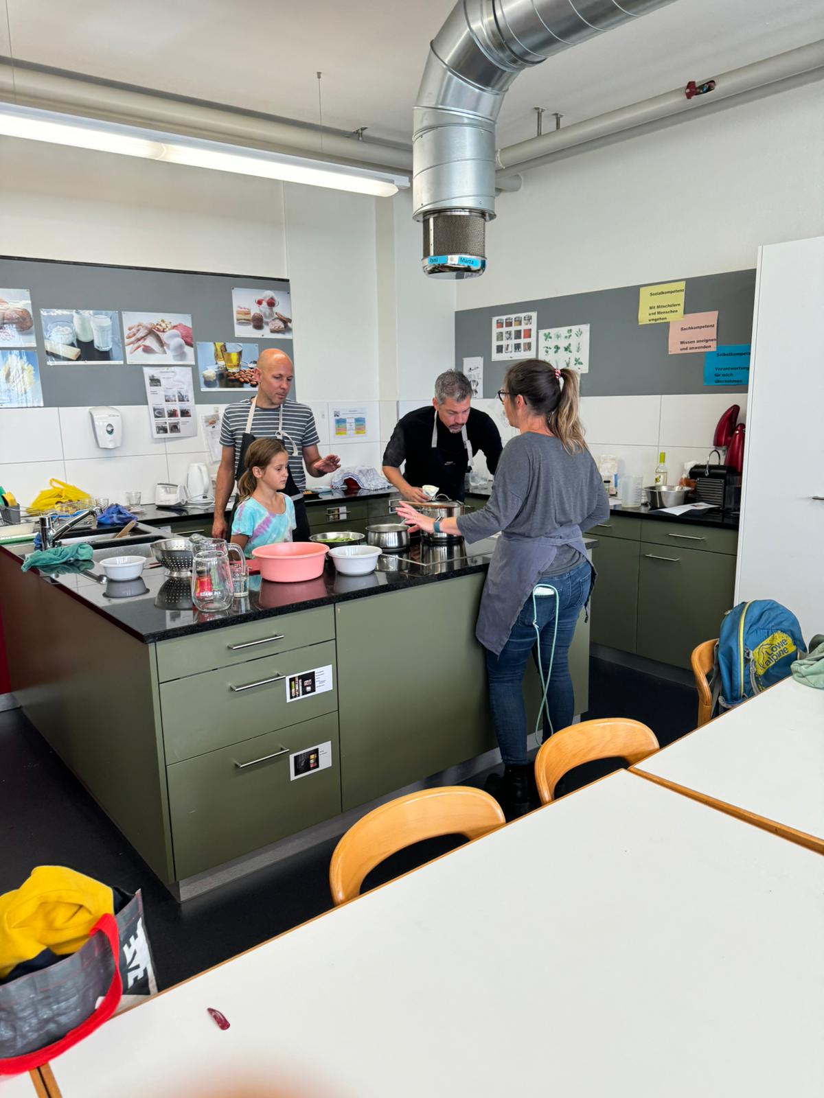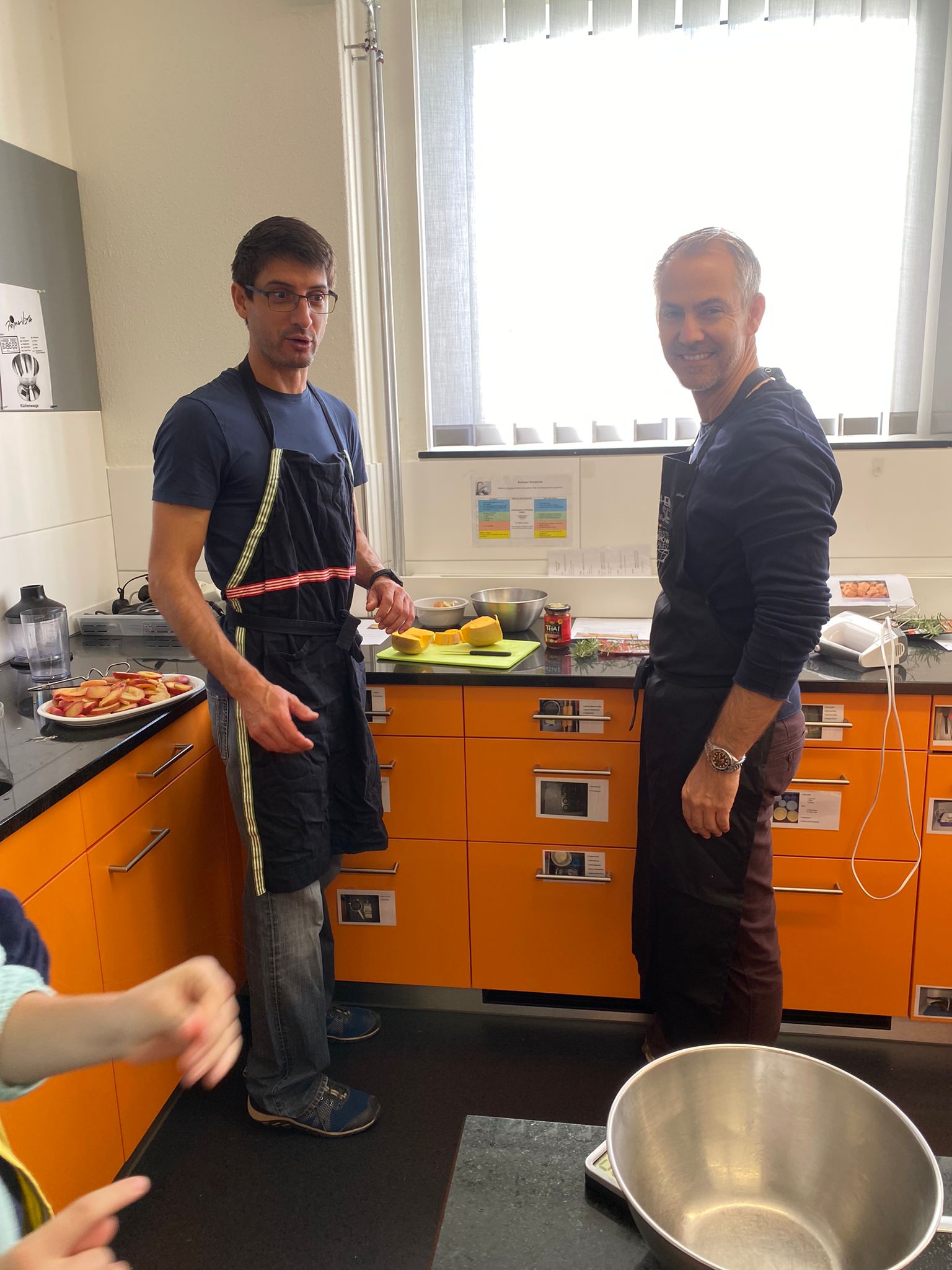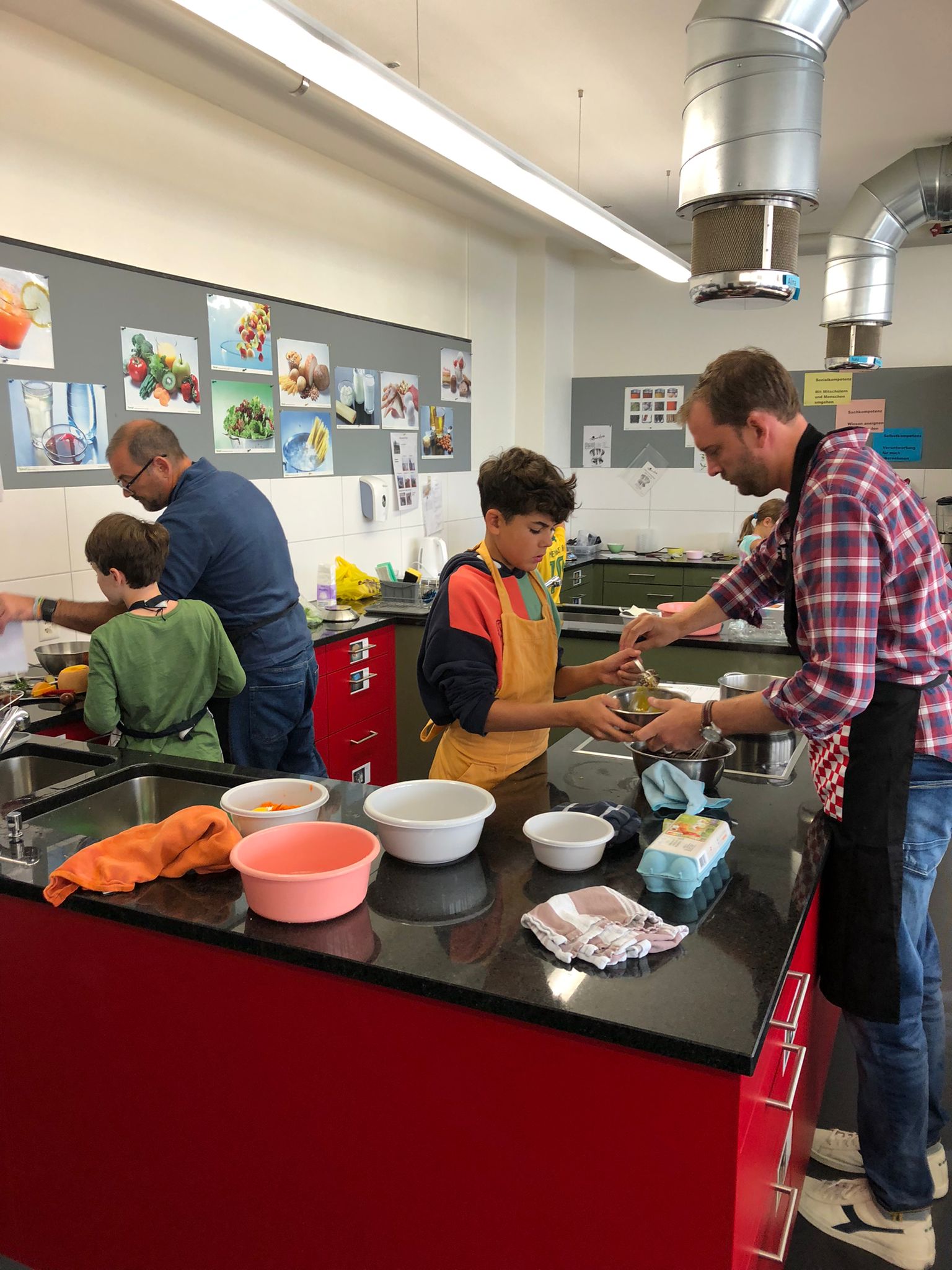 Die Hoffnungen vieler der acht teilnehmenden Väter lagen wohl nach Bekanntgabe des Menus in ihren Kindern oder Lisa, unserer Kochlehrerin… Am Samstag des Kochkurses machten sich die Kinder und Väter voller Elan daran, das 4-Gänge-Menu mit Zusatzdessert zum Mitnehmen zu kochen. Der Wille war bei allen spürbar, das eine oder andere Malheur konnte aber nicht vermieden werden. Zum Glück wurden einige Eier zu viel mitgebracht… Trotz gleichem Menubeschrieb konnte man bei einigen Gerichten geschmackliche sowie auch optische Unterschiede ausmachen. Der Freude ab der gelungenen Kürbissuppe oder dem geschmackvollen Schweinsfilet mit Bohnen im Speckmantel konnte dies aber keinen Abbruch tun. Zufrieden wurde das Erbrachte anschliessend bei einem feinen Glas Wein oder Sirup gegessen. Besten Dank an Lisa für die Geduld und fachkundige Unterstützung.