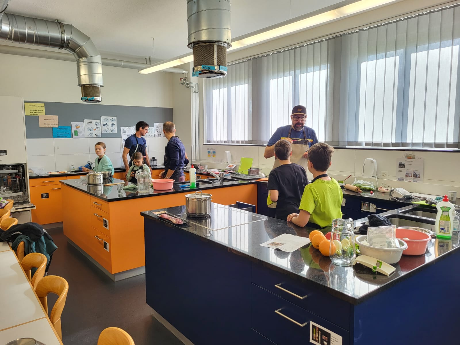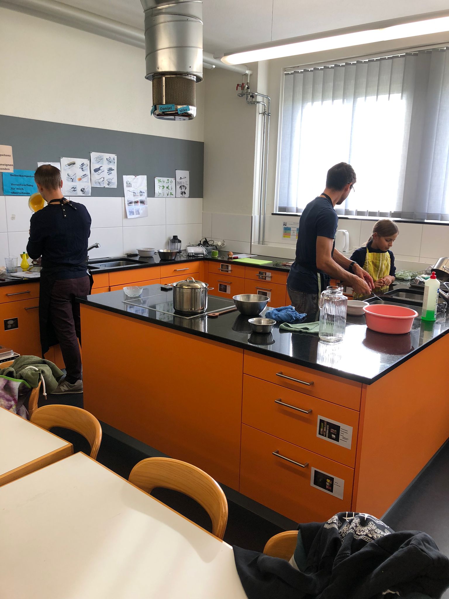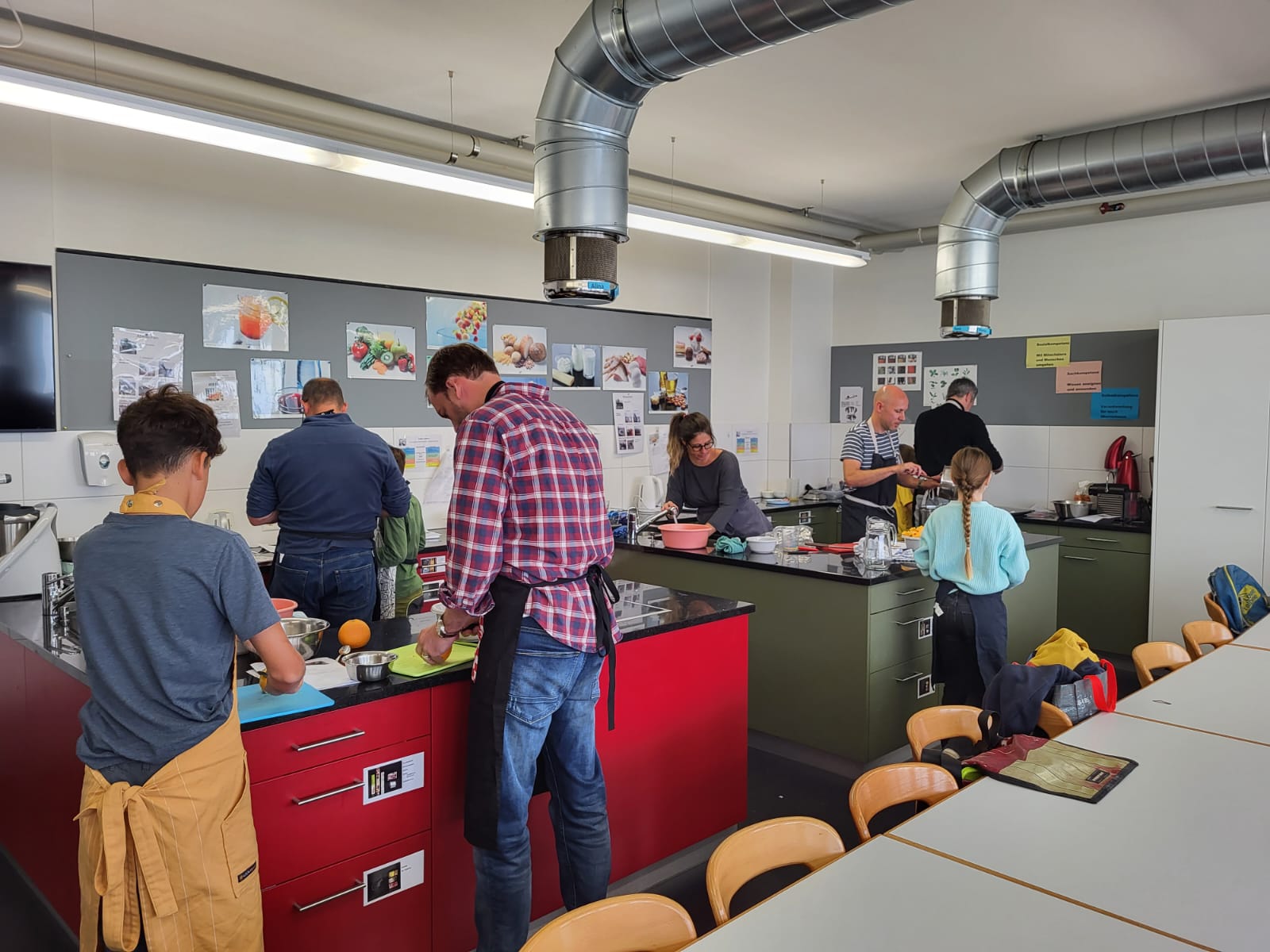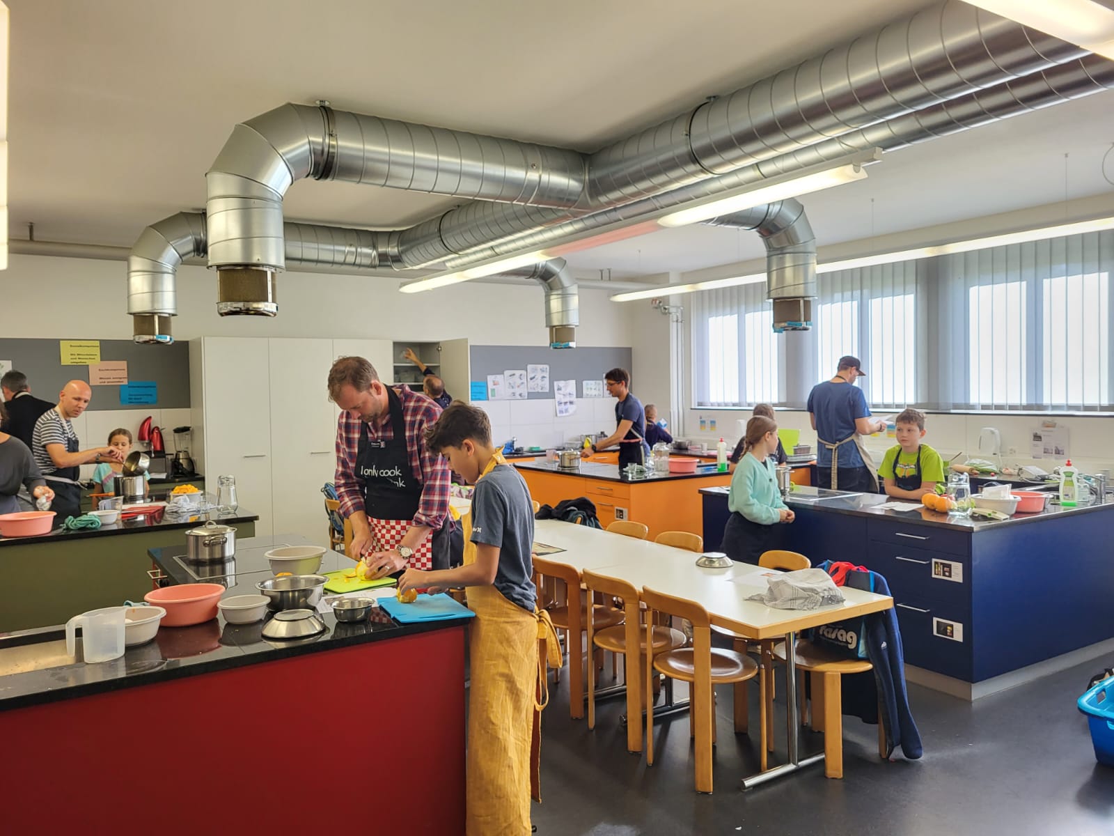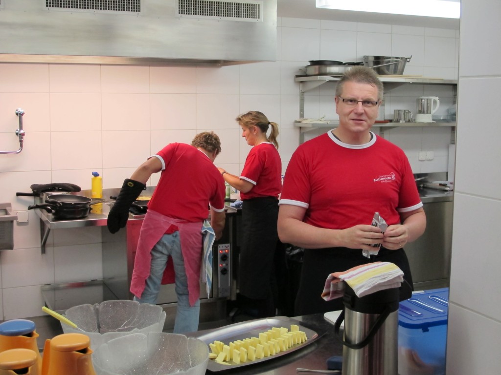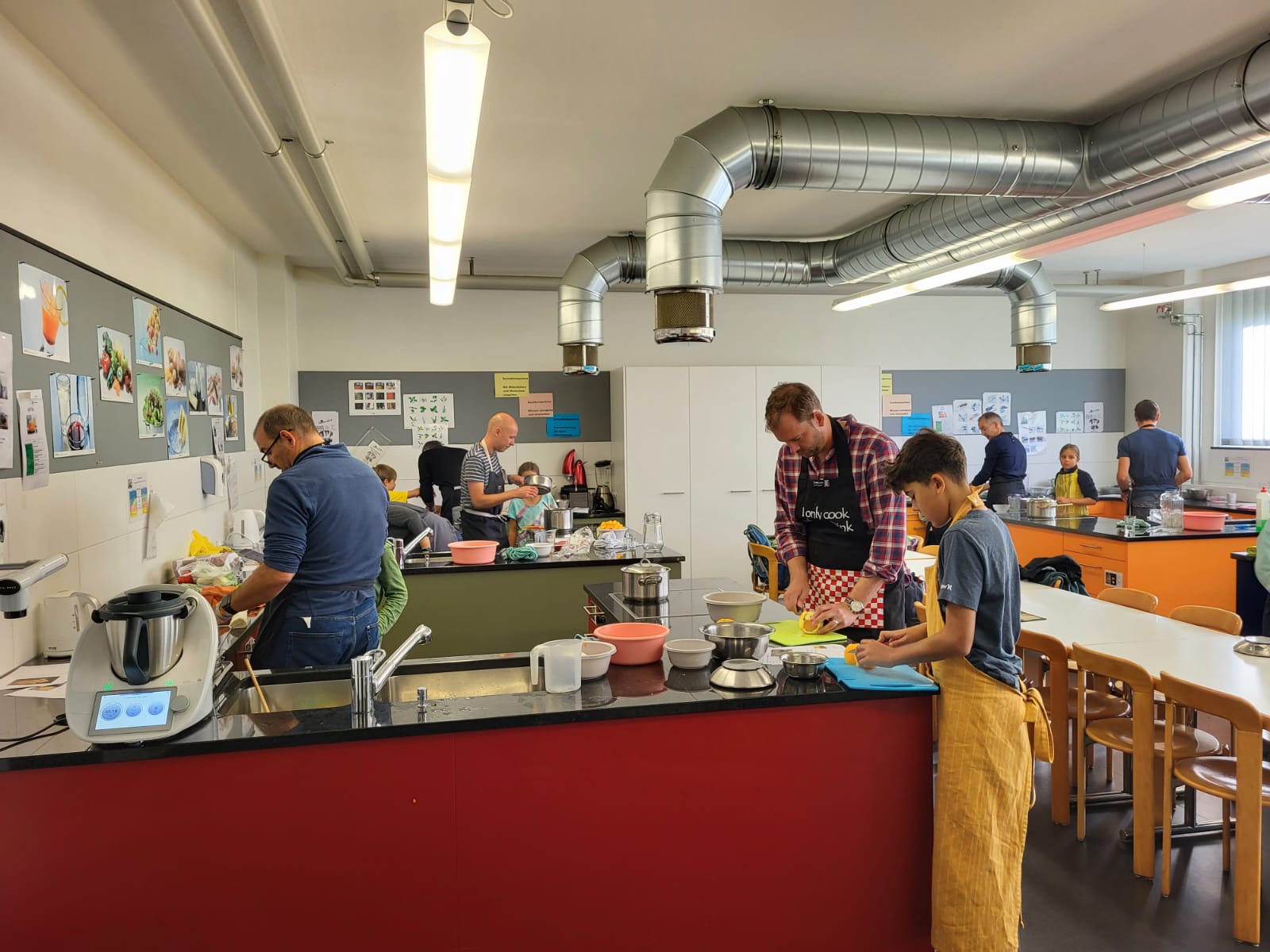 Die Hoffnungen vieler der acht teilnehmenden Väter lagen wohl nach Bekanntgabe des Menus in ihren Kindern oder Lisa, unserer Kochlehrerin… Am Samstag des Kochkurses machten sich die Kinder und Väter voller Elan daran, das 4-Gänge-Menu mit Zusatzdessert zum Mitnehmen zu kochen. Der Wille war bei allen spürbar, das eine oder andere Malheur konnte aber nicht vermieden werden. Zum Glück wurden einige Eier zu viel mitgebracht… Trotz gleichem Menubeschrieb konnte man bei einigen Gerichten geschmackliche sowie auch optische Unterschiede ausmachen. Der Freude ab der gelungenen Kürbissuppe oder dem geschmackvollen Schweinsfilet mit Bohnen im Speckmantel konnte dies aber keinen Abbruch tun. Zufrieden wurde das Erbrachte anschliessend bei einem feinen Glas Wein oder Sirup gegessen. Besten Dank an Lisa für die Geduld und fachkundige Unterstützung.